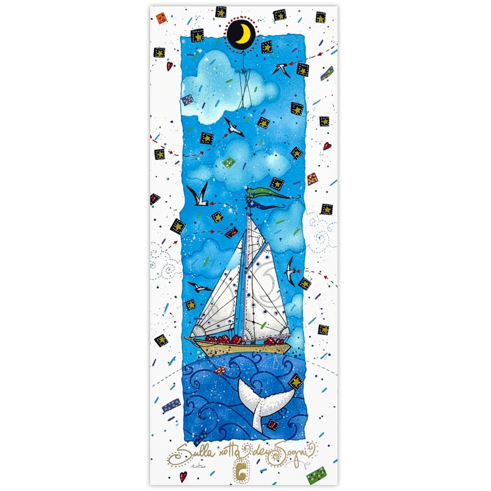 Acquista online la serigrafia "Sulla rotta dei sogni" di Andrea Agostini rappresenta un viaggio simbolico tra mare e cielo, costruito attraverso una composizione verticale intensa e ricca di dettagli narrativi. L’opera mostra una barca a vela che attraversa onde stilizzate mentre sopra di essa si apre un cielo animato da nuvole, gabbianii e piccoli elementi grafici che evocano sogni, fortuna e movimento.