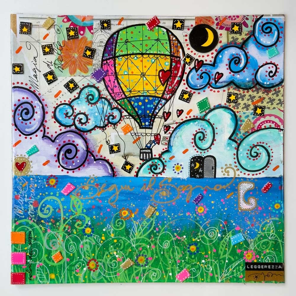 La mongolfiera colorata che vola tra nuvole, cuori e stelle diventa simbolo di libertà e sogno, trasformando l’opera in un invito a “seguire i propri sogni”.