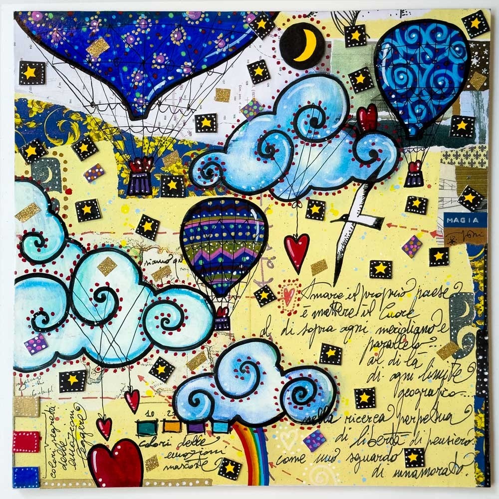 “Magia” è un’opera originale di Andrea Agostini, realizzata con tecnica mista su cartone. In questo lavoro unico (30x30 cm), una serie di mongolfiere colorate fluttua tra nuvole spiraliche, stelle luminose e scritte poetiche, creando un’atmosfera sospesa tra sogno e realtà.