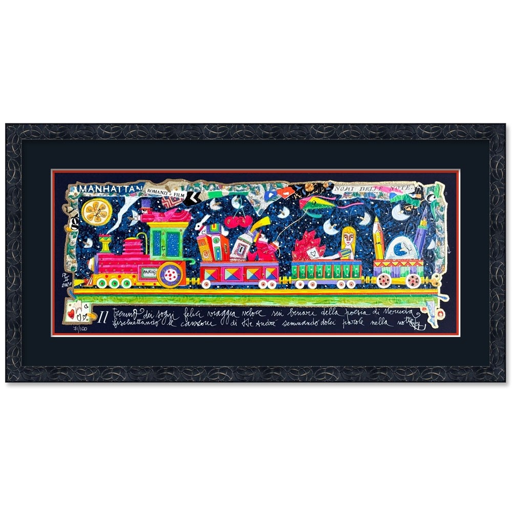 Un piccolo treno colorato attraversa la notte stellata, portando con sé valigie, sogni e frammenti di fantasia.